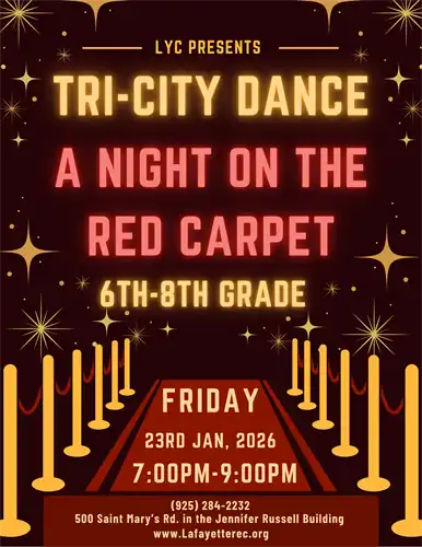 Tri-City Middle School Dance!Get ready to shine at our “Night on the Red Carpet” Tri-City dance, an unforgettable, star-studded evening at the Lafayette Community Center! Enjoy fun games, awesome activities, and a DJ playing all your favorite hits Friday, January 23rd. This is a safe, fully supervised event, staffed by city-approved adult volunteers, City staff, and City Council appointed Lafayette Youth Commissioners. Bring your friends, your energy, and your best red-carpet moves. Register early before it sells out!
